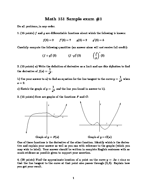 Math 151, 1995: Sample Midterm #1, page 1 of 2